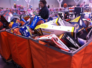 Aaron and I helped out in the toy room a.k.a a large room with tables filled with rows and rows of toys. Our job was to get our toys ready for Sunday. Aaron and I were assigned a shelter for Sunday's party. During the party, we would be responsible for our shelter making sure they had a great time and everything ran smoothly. This year we had the sweetest little shelter of 12 moms and their young children ages 1 to 8. So before they came we had to collect their presents. We had their names and toy requests and then we just went shopping in the Toy Room to make sure everyone got what they wanted from Santa himself.